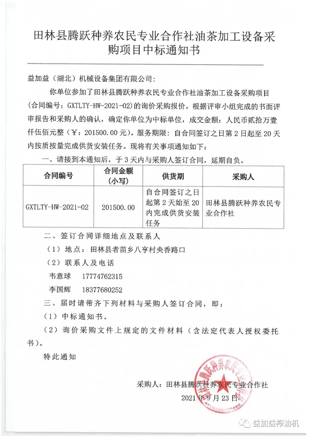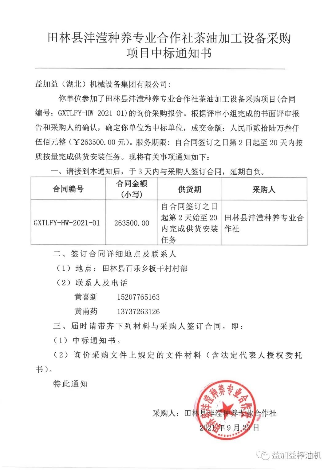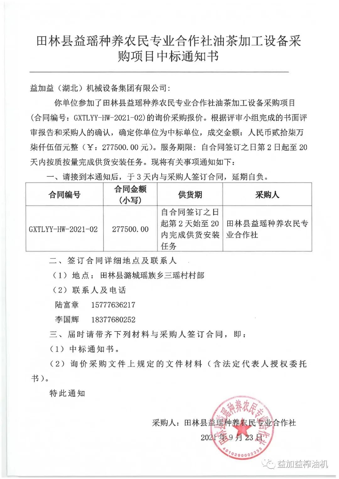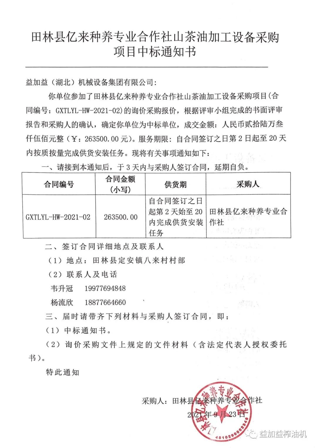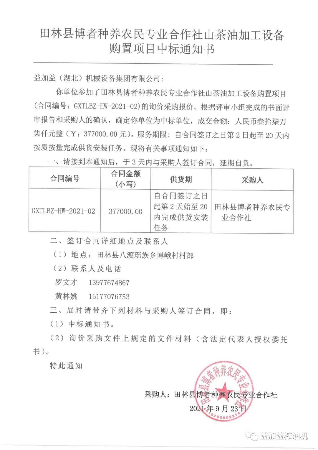 益加益集團憑借過硬的產品質量,扎實高效的工作作風,卓越的運作團隊和良好的企業(yè)信譽,在眾多競爭對手中脫穎而出,連續(xù)中標《中華人民共和國世界銀行貸款廣西貧困片區(qū)農村扶貧試點示范項目》中全部11家專業(yè)合作社山茶油加工設備的招標購置。