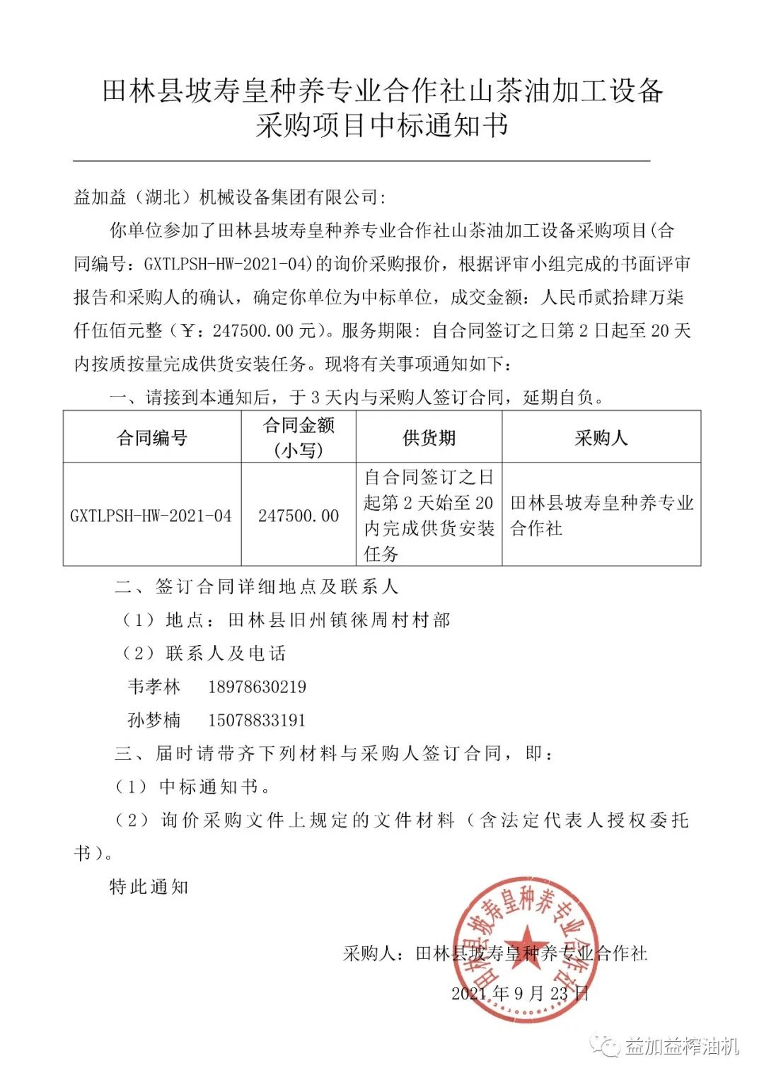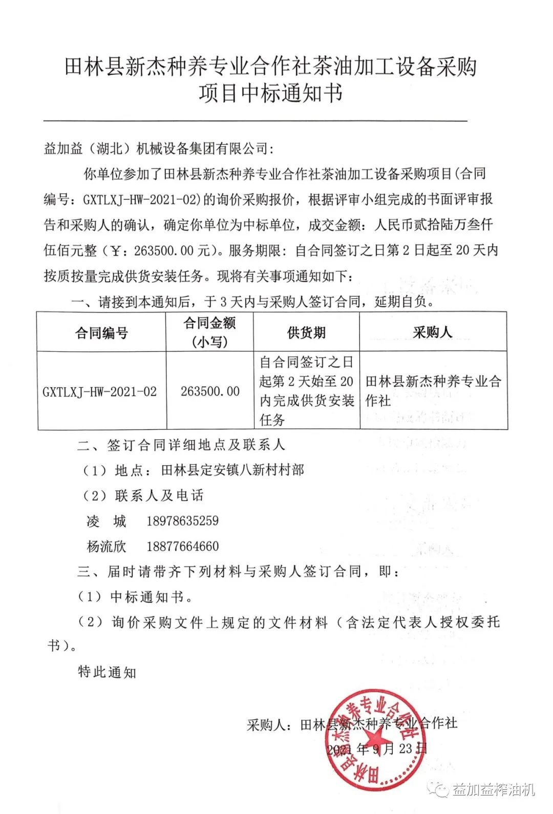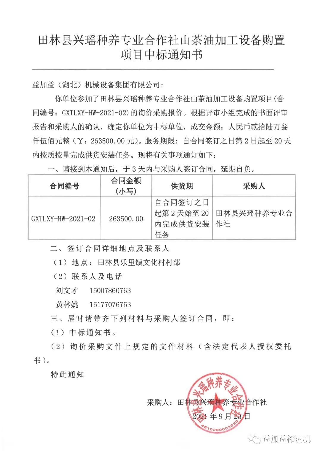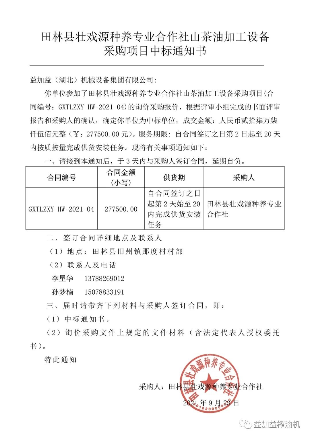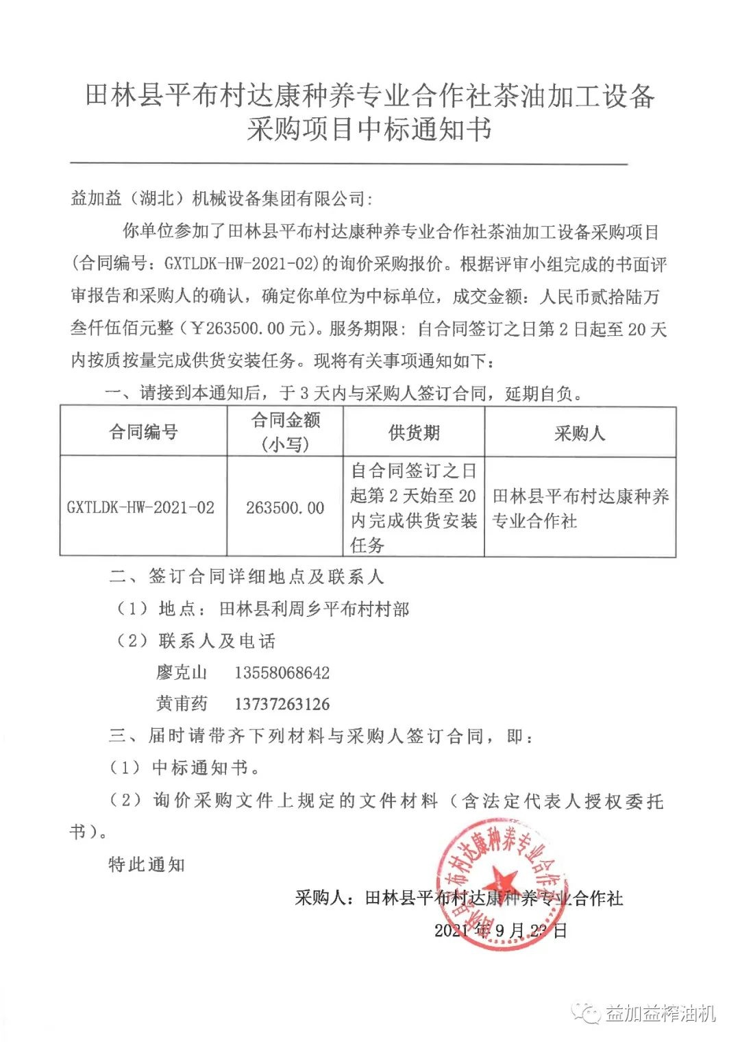 益加益集團憑借過硬的產品質量,扎實高效的工作作風,卓越的運作團隊和良好的企業(yè)信譽,在眾多競爭對手中脫穎而出,連續(xù)中標《中華人民共和國世界銀行貸款廣西貧困片區(qū)農村扶貧試點示范項目》中全部11家專業(yè)合作社山茶油加工設備的招標購置。