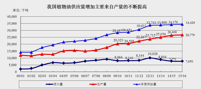 2015年度,我國食用油市場的總供給量為3442.9萬噸,其中包括國產(chǎn)油料和進口油料合計生產(chǎn)的食用油為2677.9萬噸,仍有合計為765萬噸食用油缺口需要依賴進口!